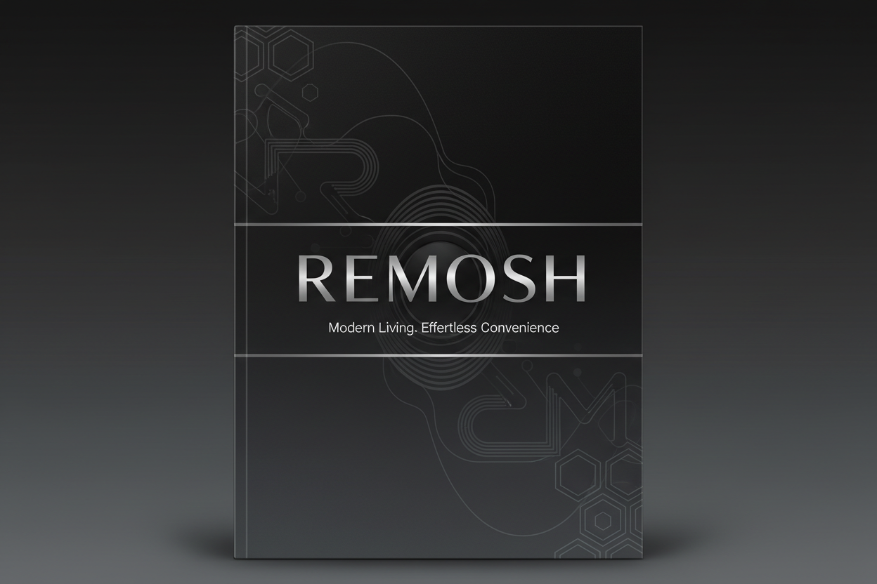I want a cover with a dark theme that transitions to dark gray, reflecting the brand's focus on making life easier with lifestyle products, and the store's name is REMOSH.